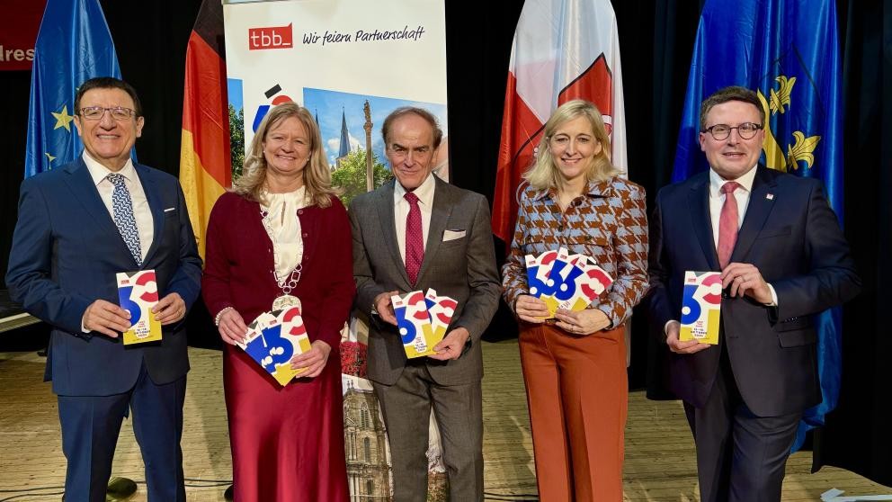 Wir präsentieren heute als Premiere das Roll-up „Wir feiern Partnerschaft“ und das Jubiläums-Logo, das die Wappen und die Farben unserer Städte harmonisch vereint – ein Symbol für Tradition und Zusammenhalt.