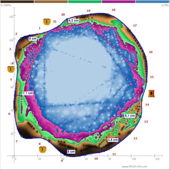 Sowohl die Schallmessung als auch die Bohrwiderstandsmessungen lassen folgern, dass der innere Stammfuß zum Großteil völlig zersetzt ist. Selbst an den Wurzelanläufen, an denen in der Regel stärkeres Holz erwartet werden kann, sind nur noch wenige Zentimeter stabiles Holz. In der Regel sind die tatsächlichen Restwandstärken höher als im Schalltomogramm, da die Schallgeschwindigkeit auch durch Rissbildungen beeinträchtigt wird (z.B. Messung bei MP 5-6).