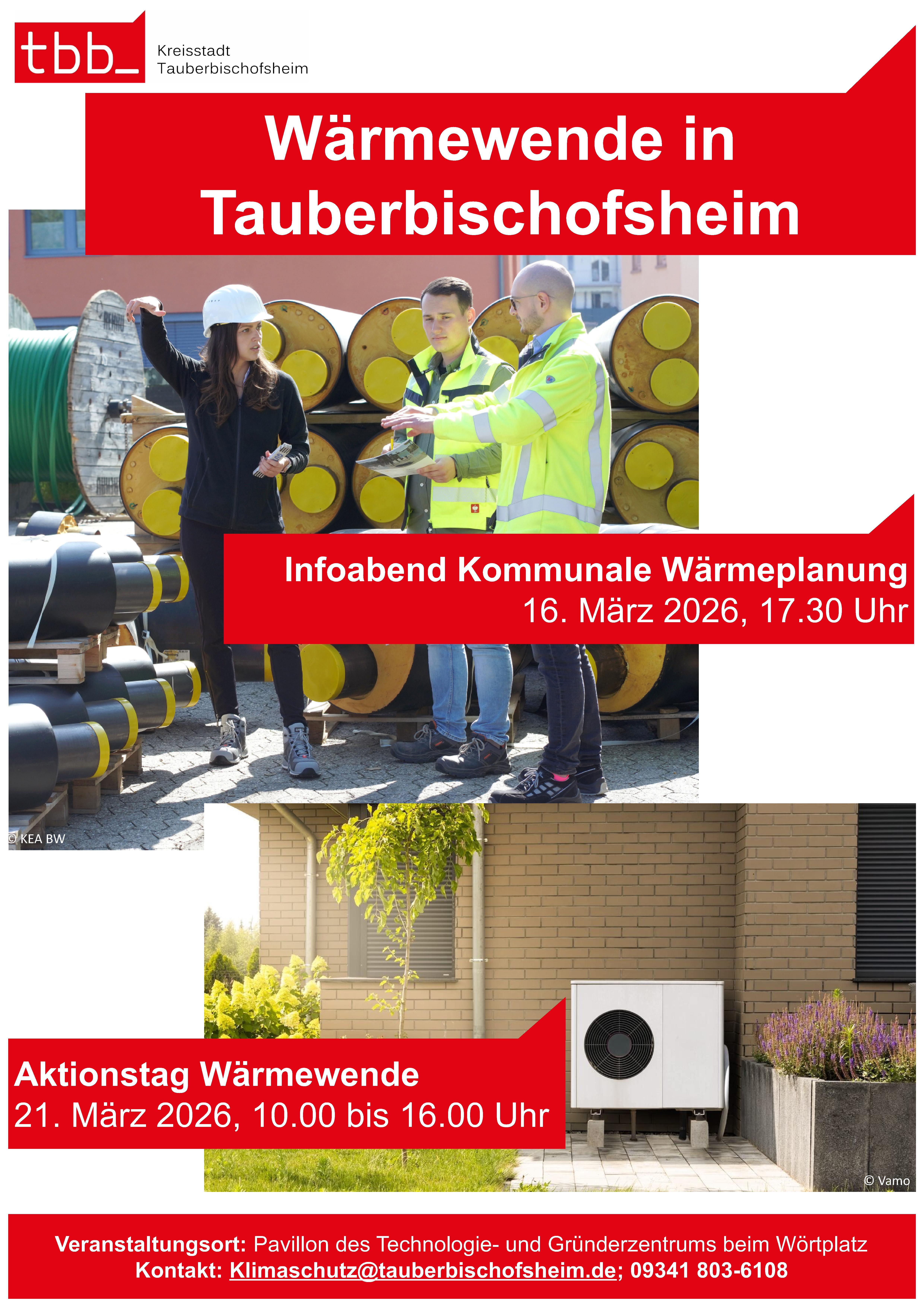 Am Samstag, 21. März 2026, findet ab 10.00 Uhr im Pavillon des Technologie- und Gründerzentrum ein umfangreicher Aktionstag zum Thema Wärmewende statt. Neben lokalen Handwerksbetrieben werden auch die Energieagentur des Main-Tauber-Kreises, Ihre Volksbank Neckar Odenwald Main Tauber, die Stadtwerk Tauberfranken GmbH und die Kreisstadt Tauberbischofsheim im Messebetrieb informieren und für Ihre Fragen zur Verfügung stehen. Der kostenfreie Eintritt ist bis 16.00 Uhr jederzeit möglich. Für Verpflegung ist gesorgt.