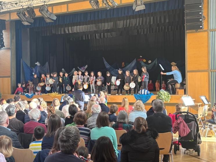 Die Bühne war liebevoll dekoriert, mit kunstvoll inszenierten Meerestieren und einer stimmungsvollen Unterwasseratmosphäre, die das Publikum in eine andere Welt entführte. Im Mittelpunkt des Programms stand eine musikalische Erzählung, die von den Kindern durch Gesang, Tanz und das Spiel auf Orff-Instrumenten eindrucksvoll umrahmt wurde. Mit großer Begeisterung stellten sie Meerestiere dar, bewegten sich zur Musik und sorgten für ein abwechslungsreiches und mitreißendes Bühnengeschehen. Jolanta Lewandowski führte die Regie und lenkte das Geschehen, während Marianne Lienich-Prößner als Erzählerin die Geschichte zum Leben erweckte.