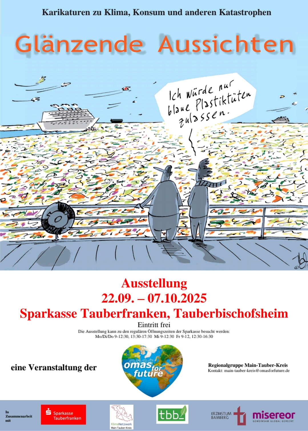 In Tauberbischofsheim findet ein Highlight der Region statt. Die Karikaturenausstellung „Glänzende Aussichten“ wird in den Räumlichkeiten der Hauptgeschäftsstelle der Sparkasse Tauberfranken (Hauptstraße 68. 97941 Tauberbischofsheim) ausgestellt. 99 Karikaturen zum Thema Klimawandel, Nachhaltigkeit und Konsum laden zum Nach- und Umdenken, zum Schmunzeln und Verweilen ein. Die Eröffnung findet am 19. September um 11 Uhr statt, in der unter anderem der städtische Klimaschutzmanager eine kurze Begrüßung an die Gäste richtet. Bis zum 7. Oktober kann die Ausstellung zu den Öffnungszeiten der Sparkasse besucht werden. Der Eintritt ist kostenfrei.