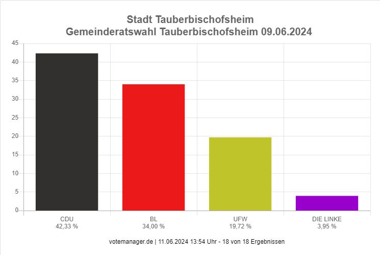 Am Sonntag, 9. Juni fanden in Tauberbischofsheim die Kommunal- und Europawahlen statt. Die Auszählung und Feststellung der Wahlergebnisse in den 15 Urnen- und drei Briefwahlvorständen wurde am Montag, 10. Juni, abgeschlossen.