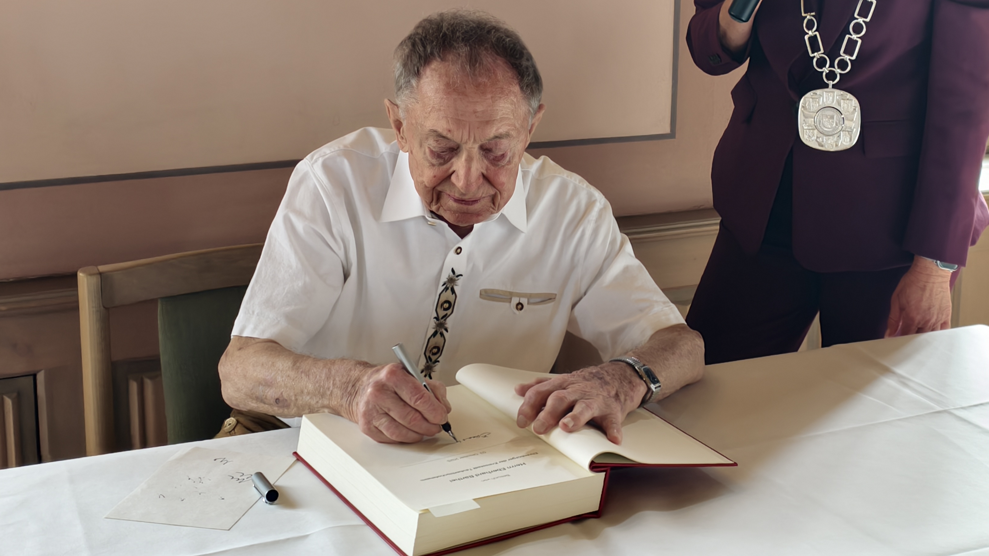 Der Gemeinderat der Stadt Tauberbischofsheim hatte die Verleihung der Ehrenbürgerwürde in seiner Sitzung einstimmig beschlossen. Für den gebürtigen Heidelberger, der in Tauberbischofsheim aufwuchs und hier seine Jugend verbrachte, war die Auszeichnung eine bewegende Überraschung - nur wenige Tage nach seinem 90. Geburtstag. Nach der Übergabe der Urkunde trug sich Eberhard Bärthel feierlich in das Goldene Buch der Stadt ein.