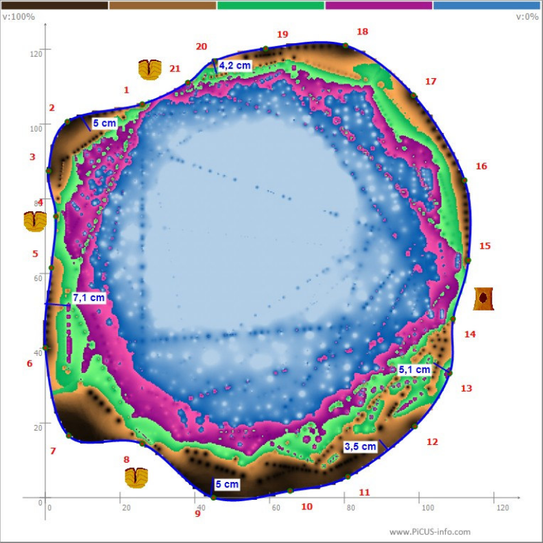Sowohl die Schallmessung als auch die Bohrwiderstandsmessungen lassen folgern, dass der innere Stammfuß zum Großteil völlig zersetzt ist. Selbst an den Wurzelanläufen, an denen in der Regel stärkeres Holz erwartet werden kann, sind nur noch wenige Zentimeter stabiles Holz. In der Regel sind die tatsächlichen Restwandstärken höher als im Schalltomogramm, da die Schallgeschwindigkeit auch durch Rissbildungen beeinträchtigt wird (z.B. Messung bei MP 5-6).