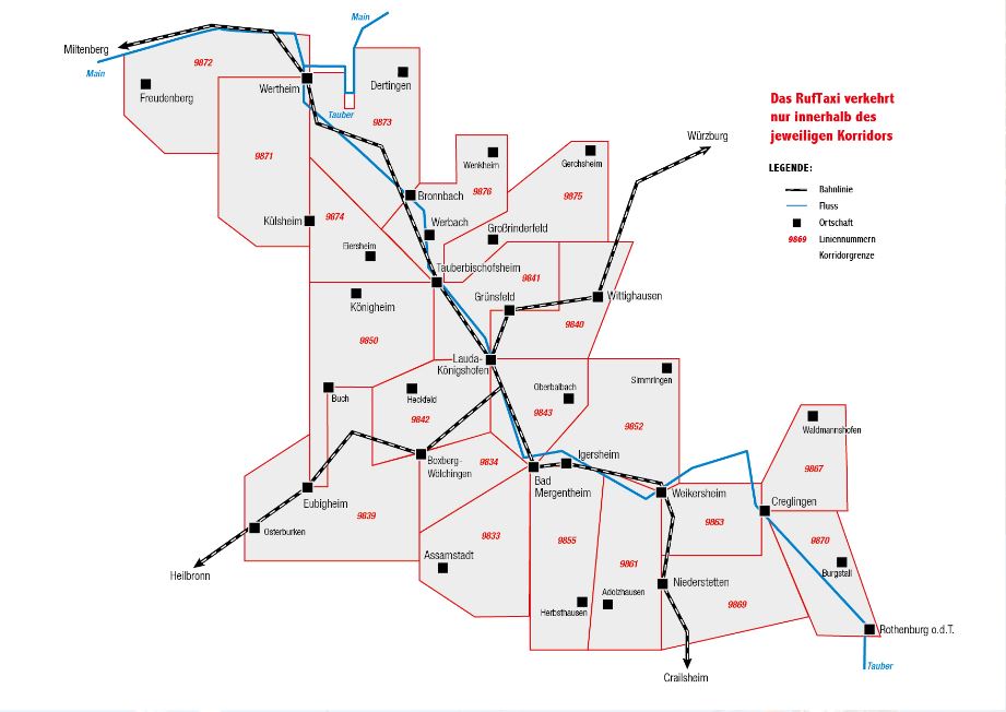 Zur Ergänzung des Bus- und Bahnangebots hat der Landkreis im Main-Tauber-Kreis ein flächendeckendes Ruftaxi-Angebot eingerichtet. Damit sollen vor allem die Randzeiten (Abend und Wochenenden) bedient werden.