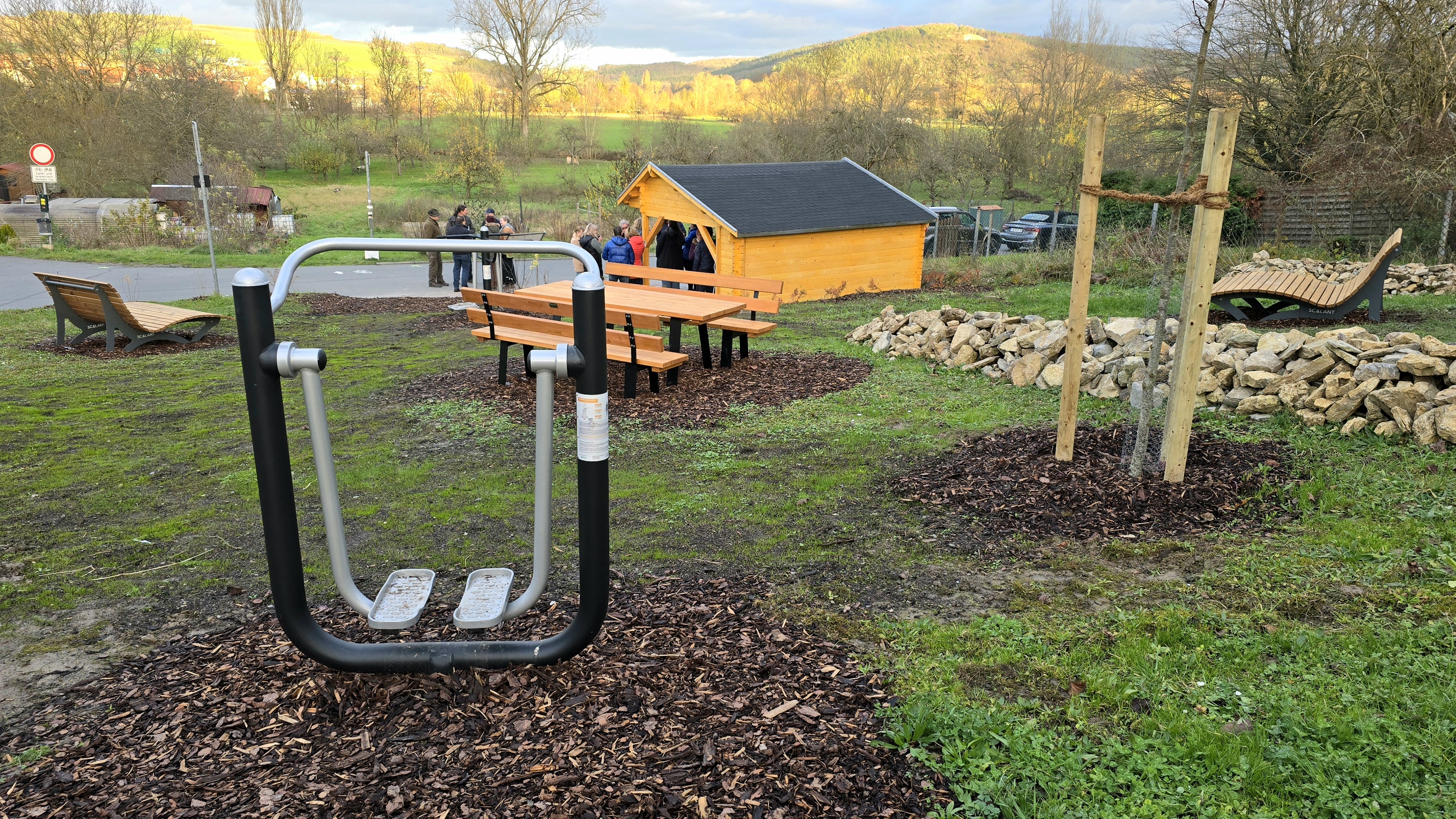 Der Begegnungsplatz vereint zahlreiche Elemente, die sowohl für Sport, Erholung als auch Naturerlebnis geschaffen wurden: Fitnessgeräte, Sitzgruppen und Waldsofas laden zum Bewegen und Verweilen ein. Ein neu errichteter Pavillon bietet Schutz vor Wind und Wetter. Ein Insektenhotel, gestaltet von Hubert Schlusche und bestückt von Tobias Hornung, sowie die naturnahe Bepflanzung fördern die Artenvielfalt. Die Pflanzung einer Dorflinde setzt ein Zeichen für Tradition und Nachhaltigkeit. Die naturnahe Gestaltung wurde in Zusammenarbeit mit Irmgard Wernher-Lippert vom NABU umgesetzt, die die Pflanzen auswählte und auch aktiv bei der Bepflanzung mitwirkte.