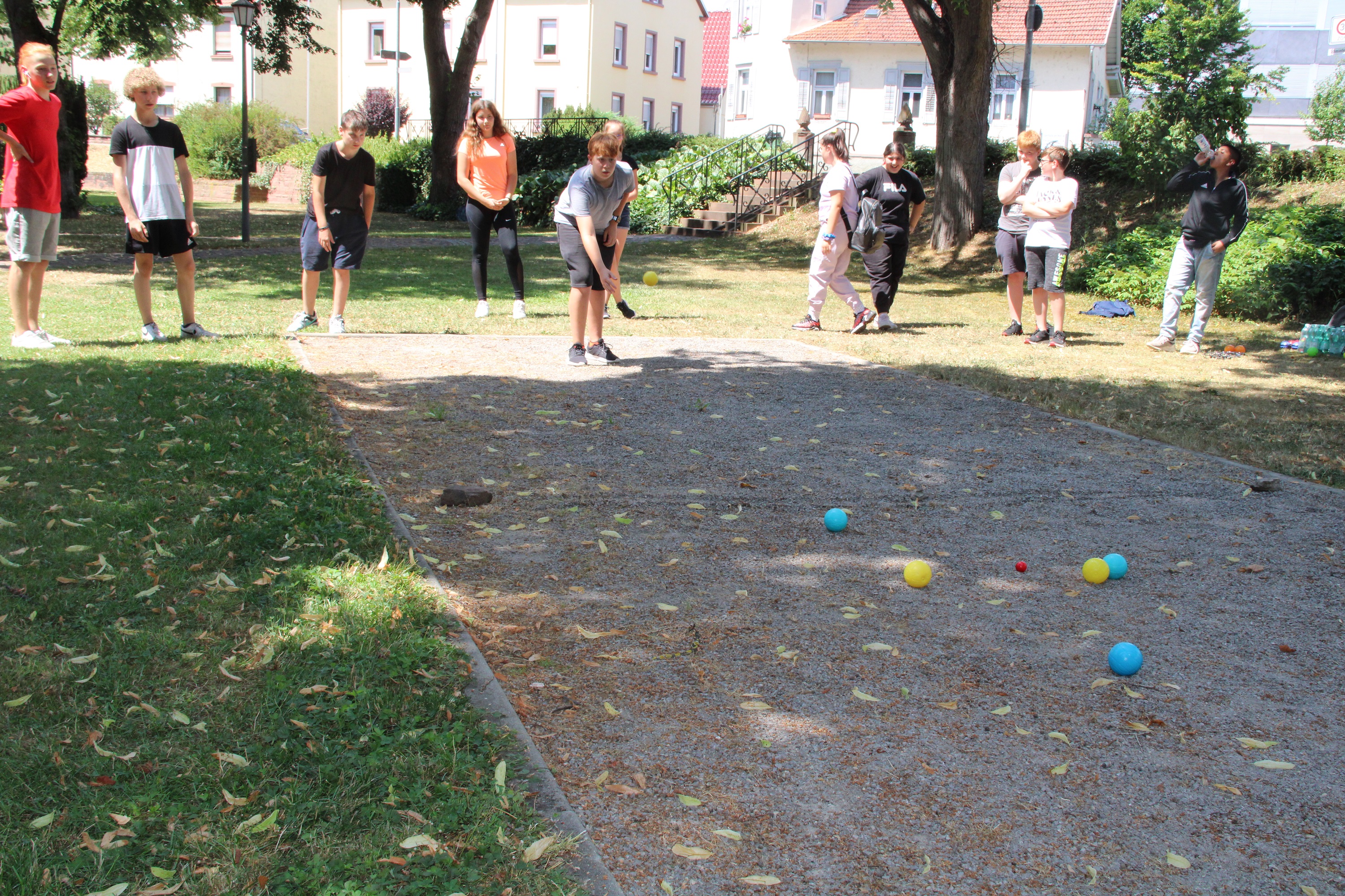 Bereits zum zweiten Mal organisierten die beiden Schulsozialarbeiterinnen Birgit Schmitt und Christine Döring gemeinsam mit dem Jugendhaus unter Leitung von Conny Seidel ein Boule-Turnier im Froschgraben. Die Schüler*innen der siebten Klassen aus dem Schulzentrum am Wört mit Realschule, Werkrealschule und SBBZ (Sonderpädagogisches Bildungs- und Beratungszentrum) und dem Matthias-Grünewald-Gymnasium spielten gemeinsam.