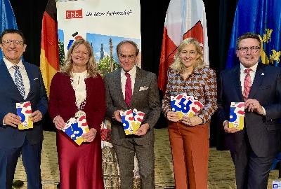Wir präsentieren heute als Premiere das Roll-up „Wir feiern Partnerschaft“ und das Jubiläums-Logo, das die Wappen und die Farben unserer Städte harmonisch vereint – ein Symbol für Tradition und Zusammenhalt.