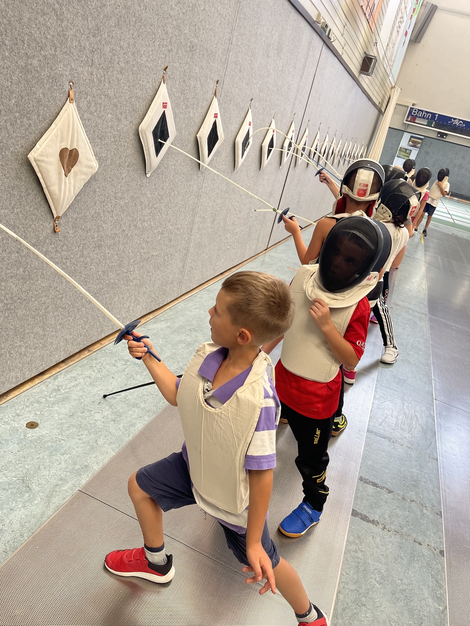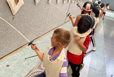 Im Rahmen des Ferienprogrammes erlebten 16 Kinder einen spannenden Tag im Fechtzentrum. Am 22. August gab der Fechtclub Tauberbischofsheim Einblicke in die Talentschmiede. Unter fachkundiger Leitung des Trainers Alexander Kreis lieferten sich die sechs bis zehn jährige Kinder ein spannendes Duell um den „Weltmeistertitel“. Nach einem kurzen Aufwärmtraining durch Kennenlernspiele und Eierlaufen durch Hindernisse, lernten die jungen Fechter erstmal die drei Waffen Florett, Säbel und Degen kennen. Die richtige Fechtstellung und die taktischen Bewegungen, wie den Ausfallschritt, hatten die Kinder schnell gelernt. Fehlen darf auch der Fechtgruß am Ende niemals. Nach erstem zaghaftem Abtasten entwickelte sich schnell ein rasantes, aber trotzdem sportliches und faires Duell mit dem Florett. Nacheinander wurden die Paare durchgemischt und jeder konnte gegen jeden sein Können beweisen.