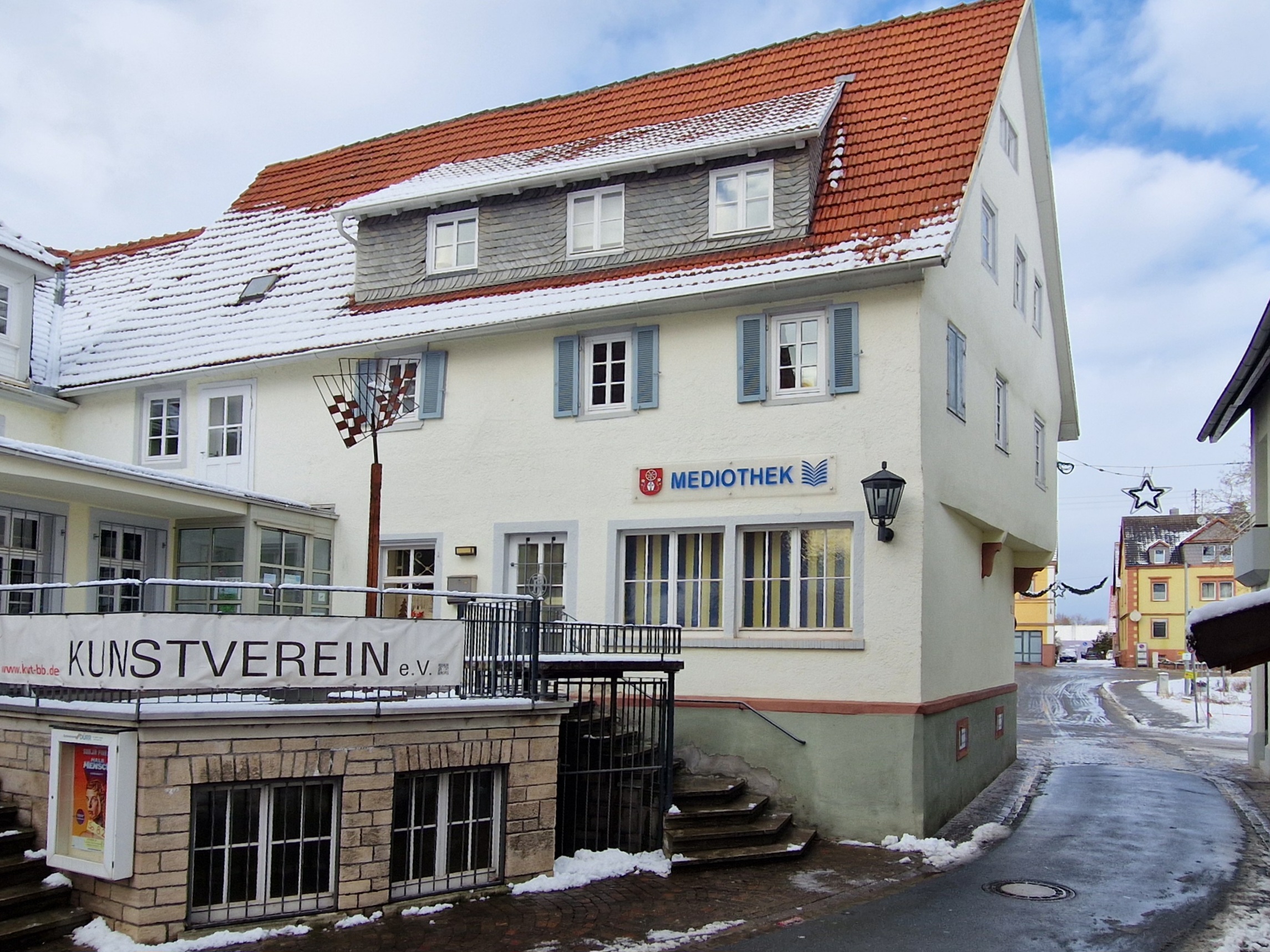 Im historischen Gebäude des ehemaligen Gasthauses "Zum Engel" bietet die Mediothek auf drei Stockwerken eine vielfältige Auswahl unterschiedlichster Medienarten für alle Altersgruppen.