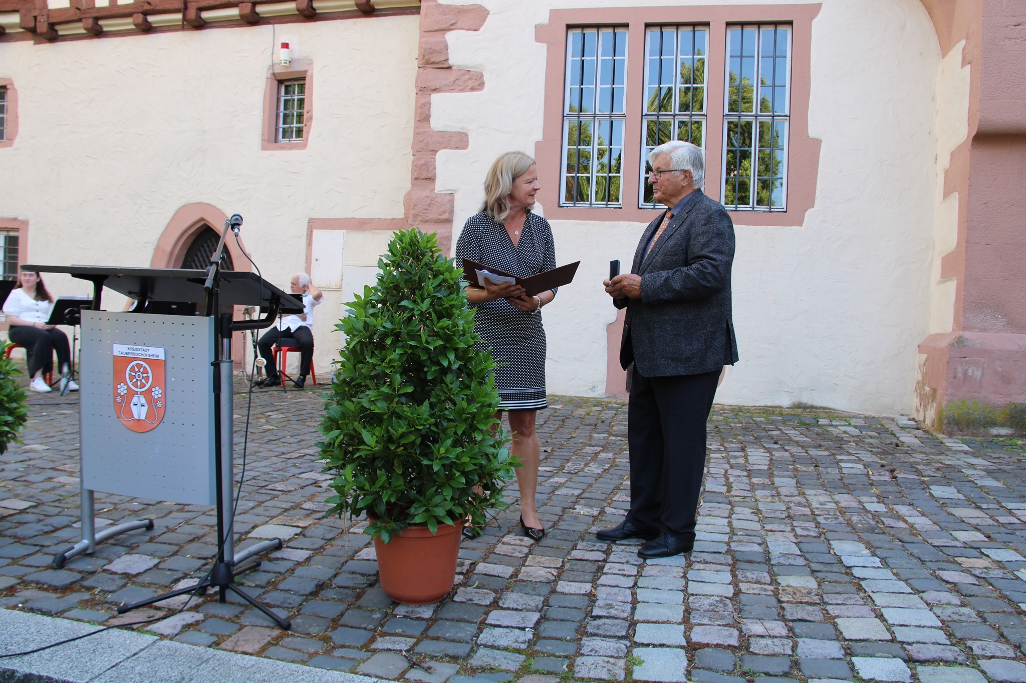 Am Freitag, 30. Juli wurde die Schlossmedaille der Stadt Tauberbischofsheim an Gernot Wamser vor der Kulisse des Kurmainzischen Schlosses verliehen. Mit der höchsten Auszeichnung der Stadt werden Personen geehrt, die sich nachhaltig um das Wohl der Stadt verdient gemacht haben. „Seit der Einführung der Medaille vor nun fast genau 23 Jahren sind Sie, Herr Wamser erst die vierte Person, deren herausragende Verdienste für Tauberbischofsheim damit gewürdigt werden. Sie befinden sich damit in guter Gesellschaft mit Dr. Thomas Bach, Hela Julier und Eberhard Bärthel,“ führt Bürgermeisterin Anette Schmidt in ihrer Ansprache aus.
