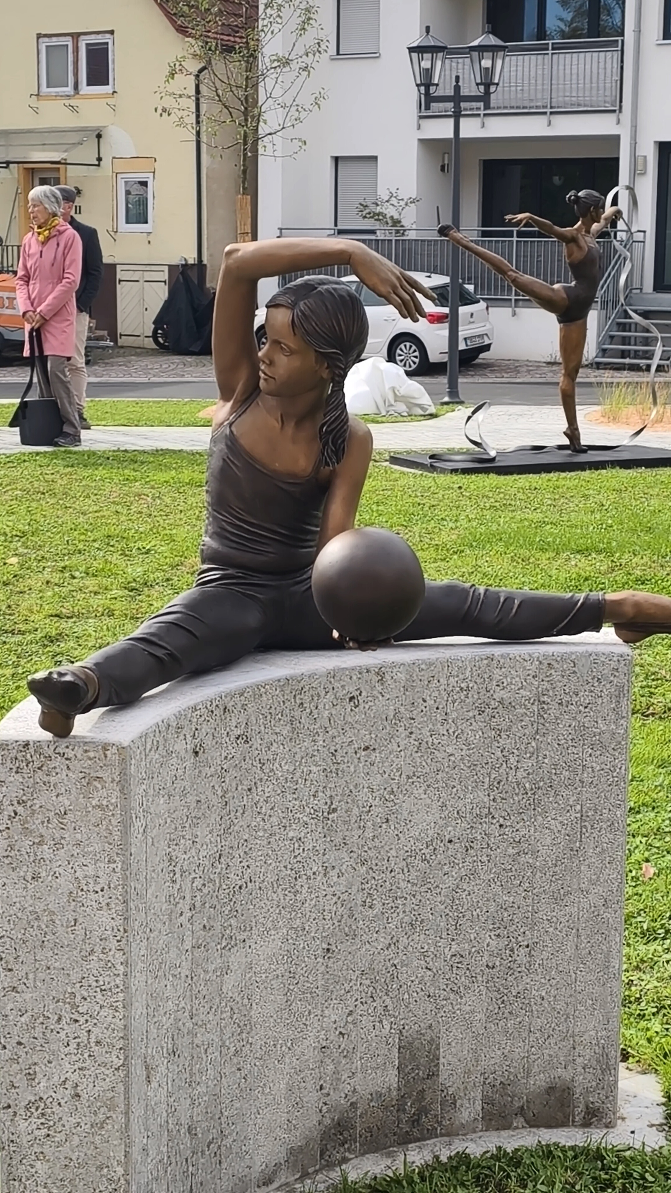 Wo früher viel befestigte Fläche war, lädt nun eine groß zügige Grünfläche zum Verweilen und Bewegen ein. Das Verhältnis von Rasen zu Pflaster wurde deutlich zugunsten der Natur verändert – ein Schaubild vor Ort verdeutlicht diesen Wandel. Der Schlosspark bietet Raum für alle Generationen: mit zwei Bodentrampolinen, einer Slackline, vier Parkbänken und zwei drehbaren Holzliegen, die aus einer Bürgerbeteiligung hervorgingen. Ein besonderer Blickfang sind die vier Bronzefiguren des Künstlers Leo Wirth, die in der Kunstgießerei Strassacker gegossen wurden und die Turnkunst in ausdrucksstarker Bewegung zeigen – eine Hommage an die sportliche Vergangenheit des Stifters. Auch in ökologischer Hinsicht wurde auf Zukunft gesetzt: Mit dem neuartigen Duftrasen entschied man sich für eine robuste, pflegeleichte und klimaresistente Lösung – ideal für die Lage über der Tiefgarage.